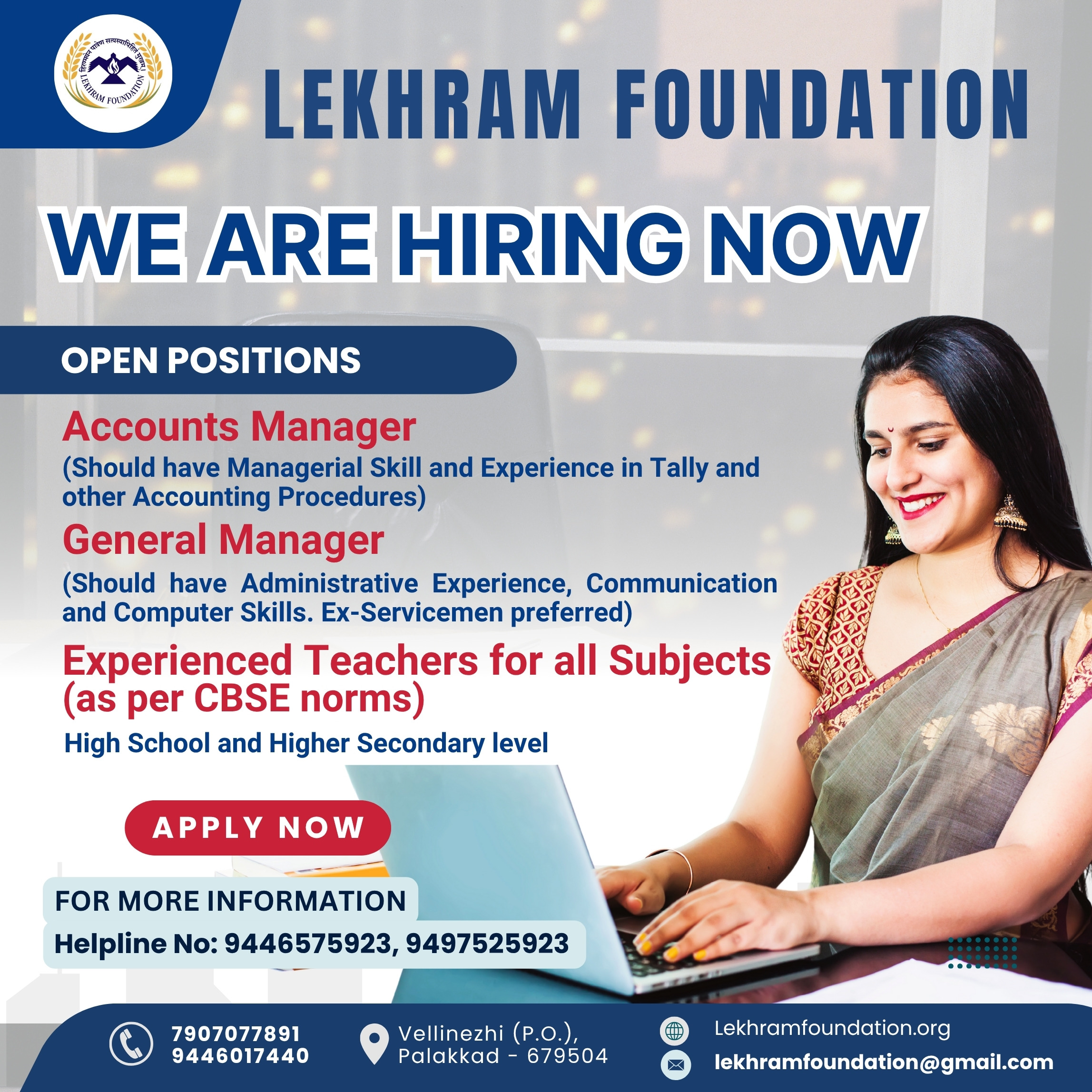 We are hiring for the following positions 1.Accounts Manager* Should have Managerial Skill.* Experience in Tally and other Accounting procedures. 2.General Manager* Should have Administrative Experience.* Communication and computer skills.* Ex- Servicemen preferred. 3.Experienced Teachers for all Subjects as per CBSE norms* High School and Higher Secondary level. For more information:Helpline No: 9446575923, 9497525923Email: lekhramfoundation@gmail.com…