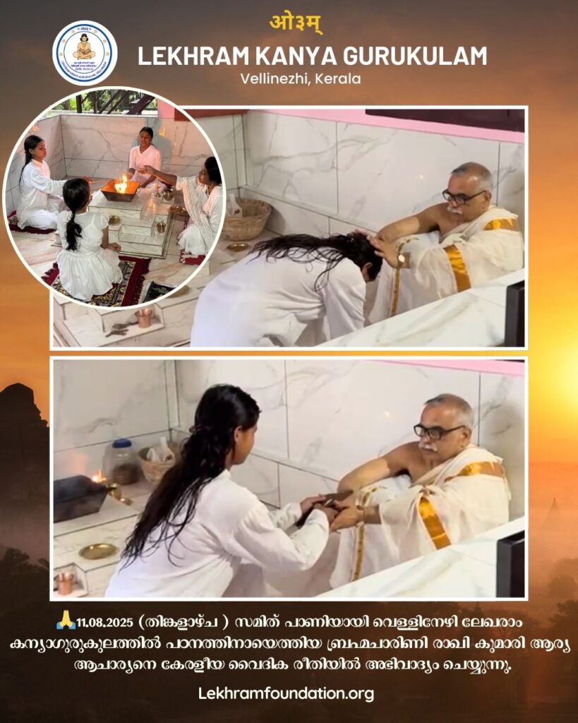 11.08.2025 (തിങ്കളാഴ്ച) സമിത് പാണിയായി വെള്ളിനേഴി ലേഖരാം കന്യാഗുരുകുലത്തില്‍ പഠനത്തിനായെത്തിയ ബ്രഹ്മചാരിണി രാഖി കുമാരി ആര്യ ആചാര്യനെ കേരളീയ വൈദിക രീതിയില്‍ അഭിവാദ്യം ചെയ്യുന്നു.